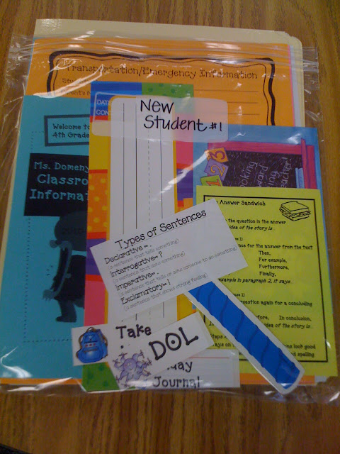 I saw a teacher do this my first year working in an Elementary school. As she set up her classroom for the new school year, she had large ziploc bags with New Student written on them. Over the next week, she filled the bags with copies of the materials she sent home. She also included a blank desk tag, sign in tag, blank job tag, etc. This way when a new student came, she was not scrambling to get materials together. The student also felt included because they didn’t have different tags for everything. This example is again from Two Things in Common.