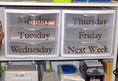 This is one of my favorite organizational tips for new teachers. Have a bin for each day of the week (and one for next week/future activities). Put all of you worksheets and materials inside of the bins the Friday before so that you are ready for the next week. No more searching for a worksheet you know you copied and put down somewhere. You can use a drawer system like the one above from Controlling my Chaos, http://www.controllingmychaos.com/2011/09/vinyl-crazy.html. Or you can use large open bins or baskets which allow you to hold more materials.