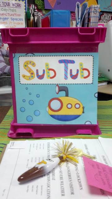 Keep a Binder or Tub ready with all of your sub materials. Items could include emergency fire drill list, dismissal list, phone numbers of important people in the school, how to use the phone (if confusing), computer log-in, important notes about students (such as allergies or things to be aware of), etc. Then all you have to do is add in your sub plans for the specific day you’re out. Also, keep emergency sub plans in the back just in case you are unexpectedly out. If you use a tub, you can also place the materials needed for the lesson inside. This example is from One Extra Degree, http://oneextradegree.blogspot.com/2011/04/sub-tub-makeover.html.