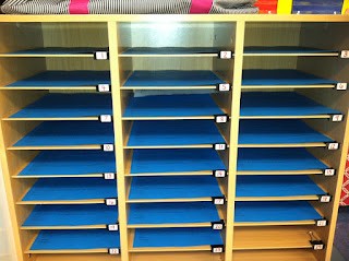 This is a great example on how to label mailboxes. Instead of writing the name and covering it year after year (which causes the mailboxes to become messy looking), use a binder clip. You can place the students name on the end of the binder clip (or number as pictured above). Then you can just replace the clips or label on the clips each year. This example is from Mrs. Wheeler’s First Grade. http://mrswheelerfirst.blogspot.com/2012/08/classroom-photos_19.html